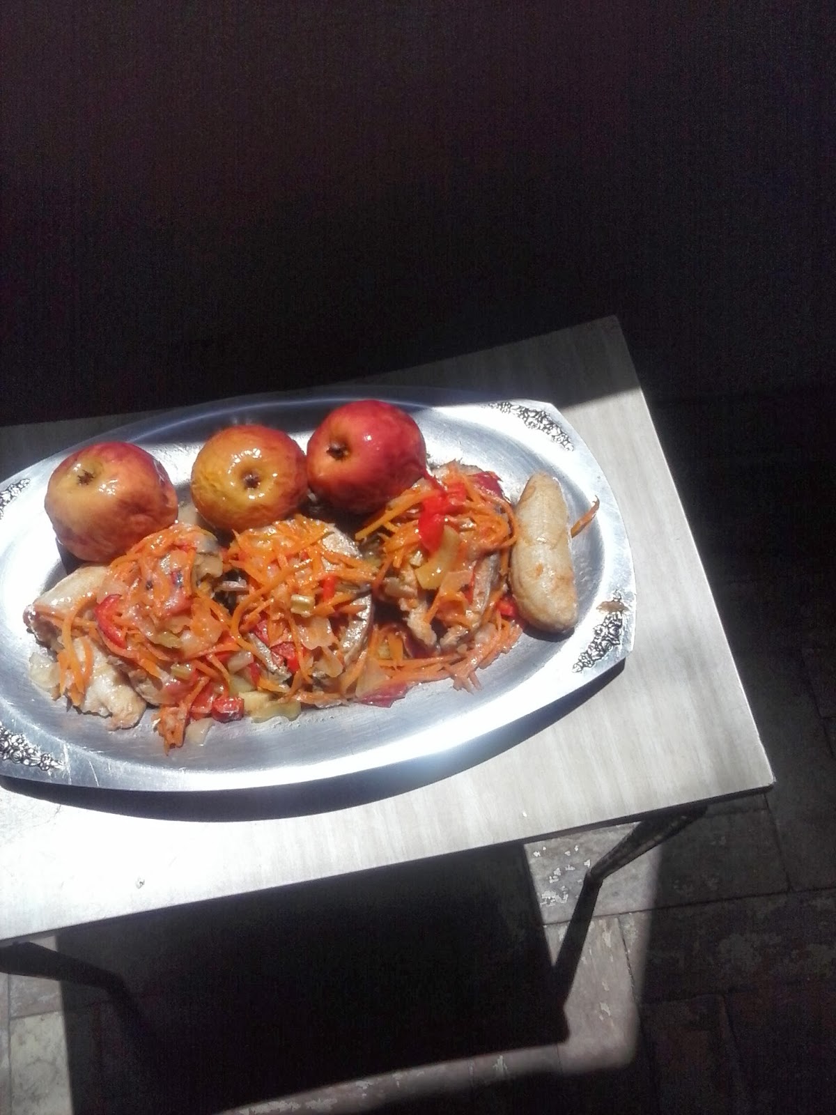 ingredientes:3 medium sized mullet cut into slices of 3 fingers each1 spoon (soup ) of shallow salt.fruits :3-4 very small apples6 bananas sliced in half if small integersauce:8-10 ripe tomatoes peeled and seeded1 cup ( tea) of grated carrots in the large drain (optional )1 cup ( tea) of shaved celery cut into thin slices1 leek only part banking thinly sliced½ cup corn oil2 large onions, thinly sliced½ spoon (soup ) of lady finger pepper , seeds removed and finely chopped without the ribs .
